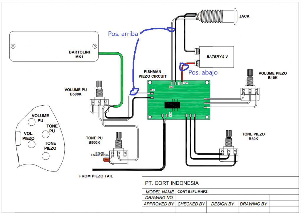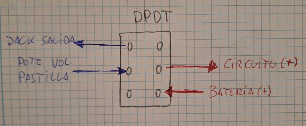 - Posición «arriba»: en esta posición se interrume el flujo de corriente de la pila al previo (con lo que el previo deja de funcionar) y además, puenteamos la salida del pote de volumen de la pastilla magnética con el jack de salida. De esta forma, es como si fuese un circuito pasivo convencional, si bien perdemos el piezo.